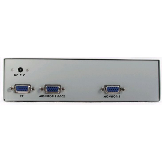Posiela videosignál z jedného počítača na dva monitory. GVS122 Multiplikátor VGA Odosiela obrazový výstup z PC na 2 monitory 1 vstupný konektor HD DB15 samica 2 výstupné konektory HD DB15 samica Rozlíšenie: až 2048x1536 pixelov Rozsah frekvencie horizontálnej synchronizácie: 30-200 KHz Rozsah obnovovania vertikálnej synchronizácie: 43-150 HZ Šírka pásma: 200 MHz pri -3 dB Napájací adaptér: DC 7V 500 mA, 2 mm stredový kolík Rozmery D x Š x V, mm: 191x85x55..