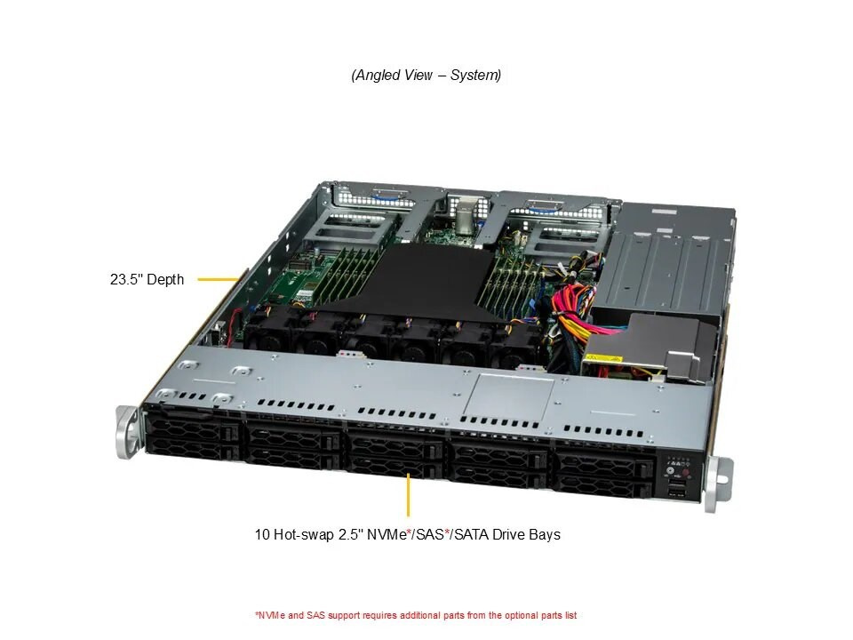 | Úložisko | 8 hot-swap 2.5" NVMe/SATA/SAS pozícií, voliteľne až 12 pozícií s ďalšími komponentmi |