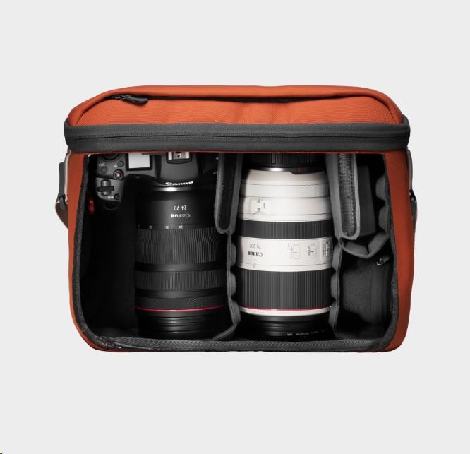 Odolný kovový rám zabezpečuje, že si taška zachová svoj tvar, a vnútro z materiálu Nylex pevne drží deliaci suchý zips. Inovatívne priehradky vo tvaru harmoniky, niektoré s pridanou policou, ďalej maximalizujú priestor. Tento záväzok je kombináciou funkčnosti a remeselného spracovania na mieru fotografom.