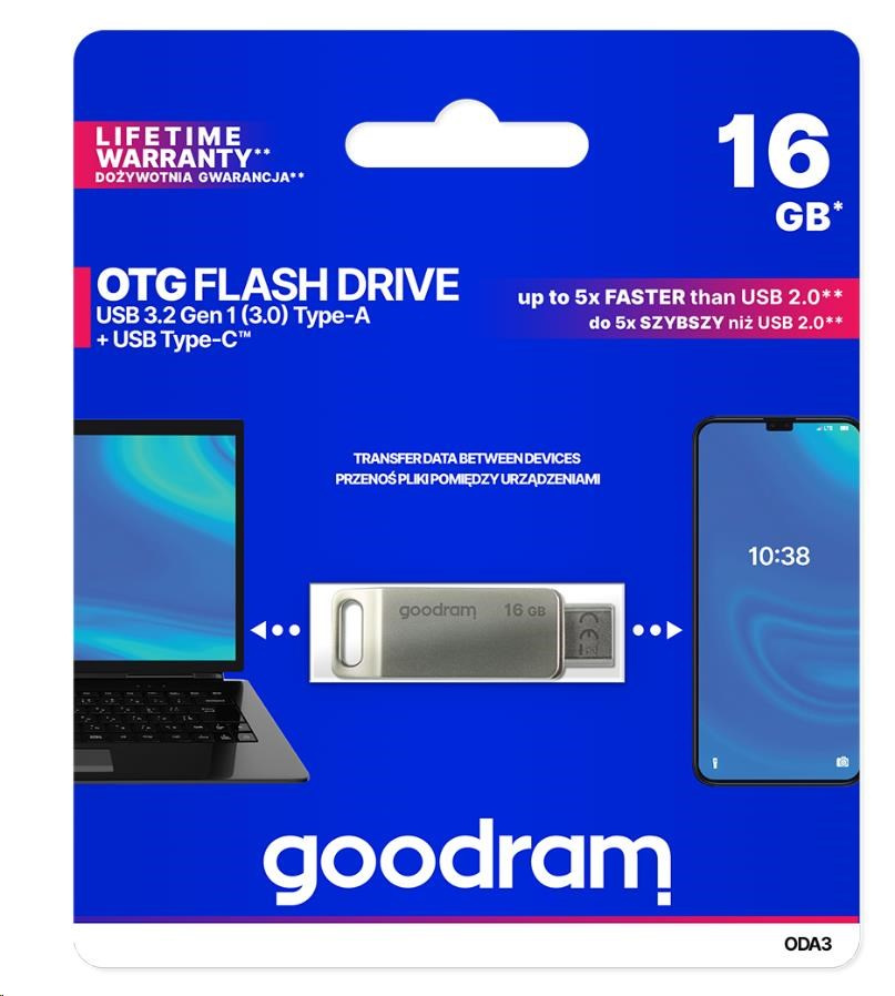 Type-C™ is becoming the most popular USB type used to transfer data between all electronic devices. The growing popularity of this solution is supported by the fact that manufacturers of next gen laptops, smartphones, PCs and other devices are increasingly equipping their products with an additional “C” next to the standard type A connector or choose only Type-C™. GOODRAM OTG ODA is an excellent solution that will work both with an old and new electronic devices generation laptops, smartphones and PCs. The ODA Flash drive is equipped with two fast USB 3.2 connectors: one standard type A and the Type-C™, which means that data transfer between devices of different generations has never been so easy and fast.