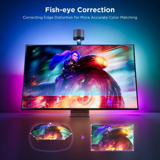 Špeciálna kamera s pokročilou technológiou Envisual inteligentne rozpoznáva a zachytáva farby na obrazovke vašej televízie alebo monitora. Na základe tejto farebnej analýzy automaticky vyhodnotí a nastaví ideálne podsvietenie. Užívajte si synchronizáciu farieb bez oneskorenia, aniž by ste potrebovali HDMI kábel alebo boli obmedzení streamovacími službami.