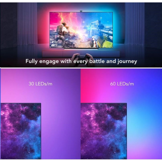 LED pásky sa inštalujú na zadnú stranu TV o veľkosti 55-65 palcov. Je možné ich rozdeliť na viac farebných častí a kombinovať ich farebné prevedenia. Objavte vysokú úroveň zážitku pri sledovaní filmov alebo hraní hier s dynamickými farbami vyžarujúcimi zo všetkých kútov vašej obrazovky (nie je optimalizované pre zakrivené televízory). Vo výbave sa nachádzajú 4 prepojené pásy, ktoré sa inštalujú na zadnú stranu TV alebo monitora.