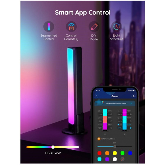 Jednoducho spravujte nastavenia farieb a intenzity svetla pomocou aplikácie Govee Home. Aplikácia je zadarmo na stiahnutie v Google Play a AppStore. Navyše získate prístup k funkcii časovača, farbám pre domácich majstrov, režimu videa, synchronizácii hudby a režimom scény. Svetlo je možné ovládať aj priamo na dodávanej ovládacej skrinke.