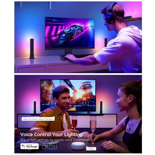 Vytvorte si ideálnu atmosféru filmu alebo hry pomocou jednoduchých hlasových príkazov. Svetlá sú kompatibilné s Alexa, Google Assistant a Siri. WiFi modul je zabudovaný v kamere, k ovládacej skrinke je pripojená iba kamera. Teraz môžete Govee Flow Plus zapnúť/vypnúť, upraviť úrovne jasu alebo zmeniť ich farbu pomocou hlasových príkazov z pohodlia pohovky alebo postele. Svetlá je možné ovládať aj pomocou riadiacej jednotky Control Box alebo pomocou aplikácie na smartfóne alebo tablete.
