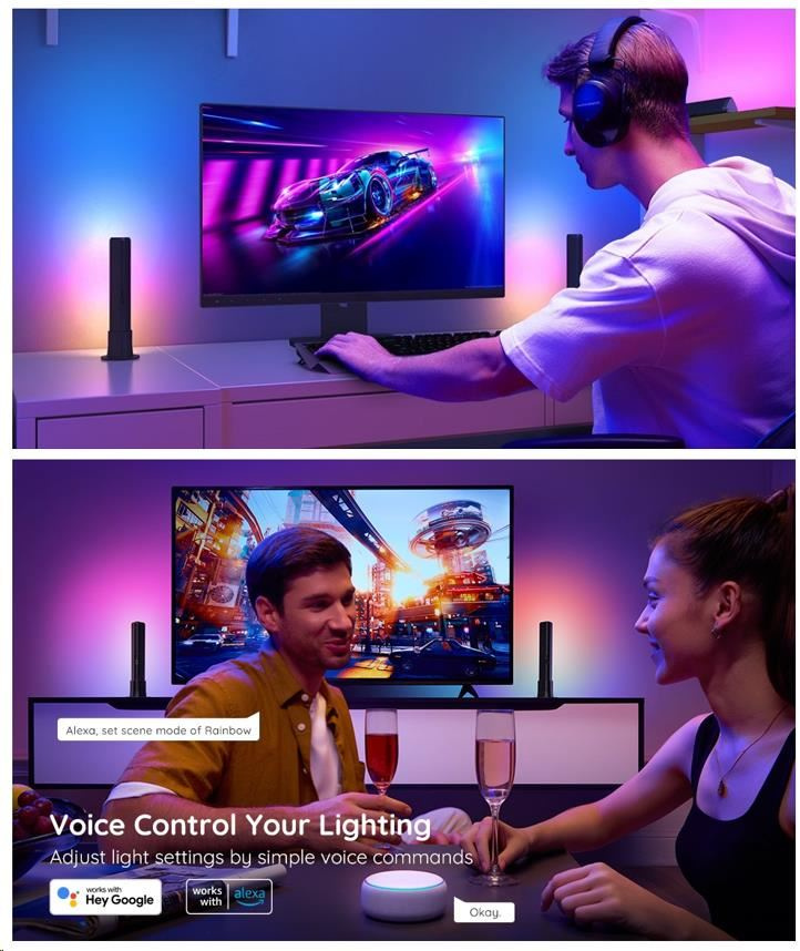 Vytvorte si ideálnu atmosféru filmu alebo hry pomocou jednoduchých hlasových príkazov. Svetlá sú kompatibilné s Alexa, Google Assistant a Siri. WiFi modul je zabudovaný v kamere, k ovládacej skrinke je pripojená iba kamera. Teraz môžete Govee Flow Plus zapnúť/vypnúť, upraviť úrovne jasu alebo zmeniť ich farbu pomocou hlasových príkazov z pohodlia pohovky alebo postele. Svetlá je možné ovládať aj pomocou riadiacej jednotky Control Box alebo pomocou aplikácie na smartfóne alebo tablete.