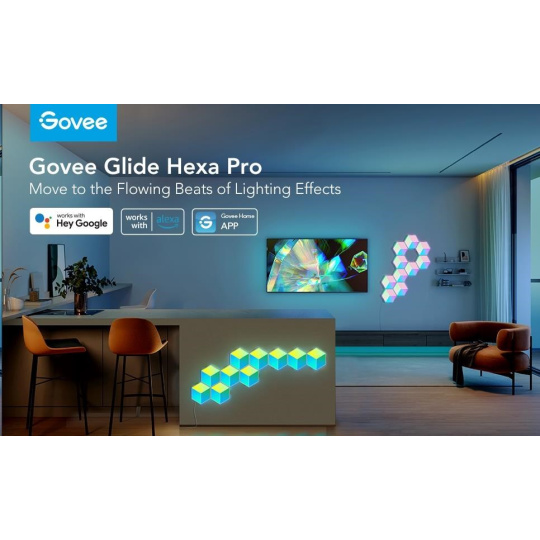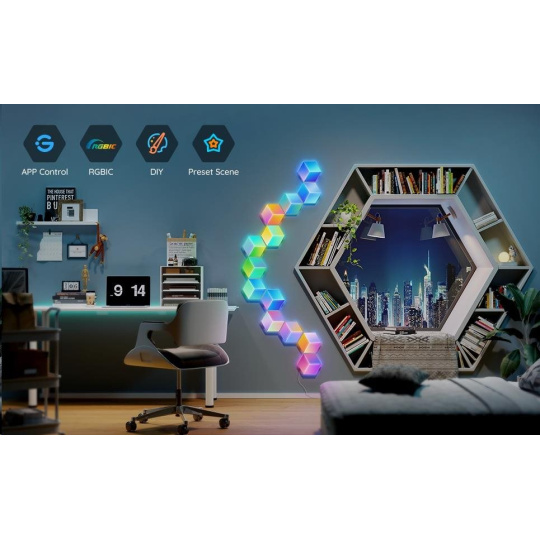 Vylepšite interiér a herné, filmové a hudobné zážitky s dizajnovým svetlom Hexa PRO 3D Smart LED. Vďaka technológii RGBIC zobrazuje až 57 farieb naraz. Farby si môžete nastaviť po jednotlivých sekciách a kreatívne si pohrať s 3D efektom osvetlenia. Celkovo dokáže zobraziť až 16 miliónov farieb s intenzitou 1-100%. Určite si vyberiete z mnohých režimov osvetlenia a pri počúvaní obľúbenej hudby si môžete zvoliť aj zo 6 rytmických režimov. Svetlá sa ovládajú hlasovo cez Siri, Amazon Alexa alebo Google Assistant alebo prostredníctvom aplikácie Govee Home na chytrom telefóne alebo tablete. Svetlo je určené na inštaláciu na stenu a jeho tvar si môžete prispôsobiť podľa vlastnej fantázie. Jednoduchá inštalácia bez vŕtania s životnosťou až 50.000 hodín.