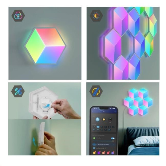 Tí, ktorí majú radi viac farieb, si zamilujú funkciu segmentového ovládania farieb, ktorú umožňuje technológia RGBIC. Prispôsobte si farbu každej sekcie 3D panelu podľa seba a vytvorte tak jedinečné osvetlenie, ktoré bude presne podľa vašich predstáv, vkusu a nálady. Každý panel má 3 časti na zobrazenie farby a efektov, ktoré môžu vytvoriť plastický 3D obraz.