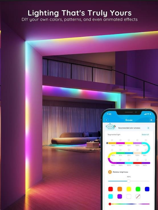 Spravujte nastavenia farieb a intenzity svetla jednoducho pomocou aplikácie Govee Home. Aplikácia je zadarmo na stiahnutie v Google Play a AppStore. Navyše získate prístup k funkcii časovača, DIY farbám, režimu videa, synchronizácii hudby a scénickým režimom. Môžete si tiež pomocou časovača nastaviť automatické vypínanie a zapínanie, napríklad podľa doby zaspávania a vstávania. Ovládanie hlasom je možné cez Siri, Amazon Alexa a Google Assistant.