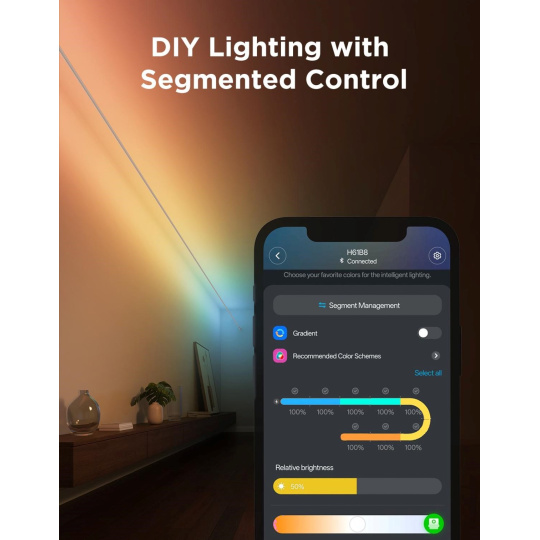 Špeciálny dizajn s LED diódami RGBICWW umožňuje presné ovládanie farieb a vytváranie realistických svetelných scén. 12 segmentov pásu je možné ovládať nezávisle, čo otvára priestor pre kreatívnu hru vďaka režimu DIY, v ktorom môžete vytvoriť doslova osvetlenie na mieru. K dispozícii je tiež viac ako 150 prednastavených efektov a 16 hudobných režimov, ktoré okamžite oživia atmosféru.