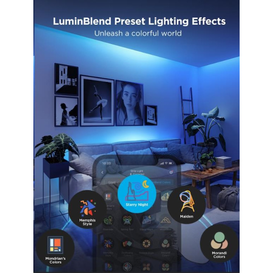 Pokročilý DIY režim LED Strip Light 2 Pro umožňuje vytvárať vlastné svetelné efekty, zatiaľ čo desiatky prednastavených scén vám poskytujú okamžitú inšpiráciu pre rôzne príležitosti – od relaxačného večera po energickú párty. Každá scéna je navrhnutá tak, aby maximálne využila možnosti plynulých prechodov farieb a dynamických efektov. So 16 miliónmi farieb si môžete hrať s nekonečnými kombináciami, ktoré sa dokonale prispôsobia akejkoľvek atmosfére. Synchronizácia s hudbou navyše zabezpečuje, že svetlá oživí každý rytmus a zvýši zážitok z počúvania.