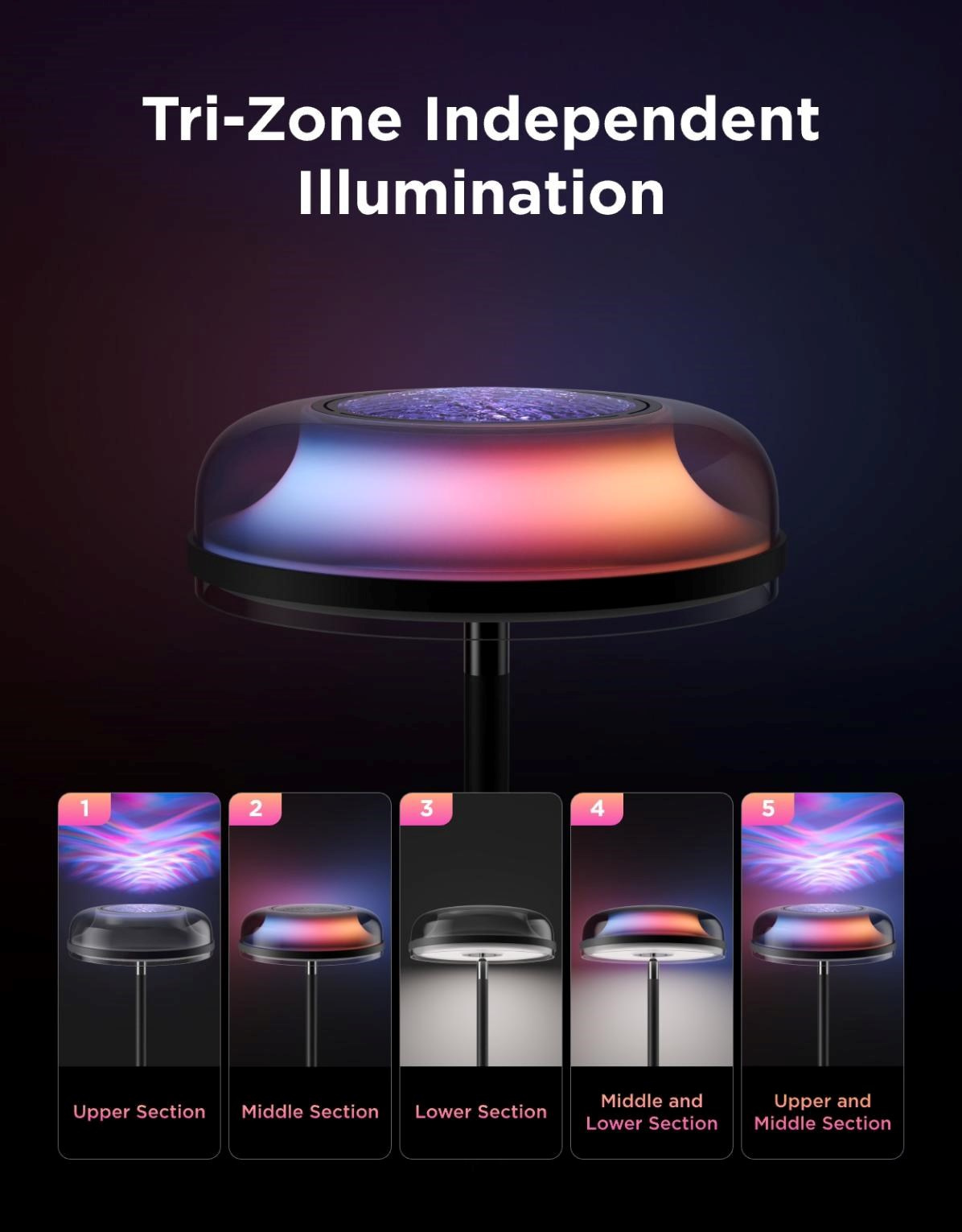 Trojité zónové osvetlenie umožňuje individuálne nastavovať spodnú, strednú a hornú časť lampy podľa vašich potrieb. Spodná LED poskytuje praktické každodenné svetlo, stredná zóna jemne osvetľuje priestor a horný projekčný efekt pridáva dramatický vizuálny zážitok. Vďaka tomuto systému môžete vždy vytvoriť dokonalú atmosféru pre každú príležitosť.