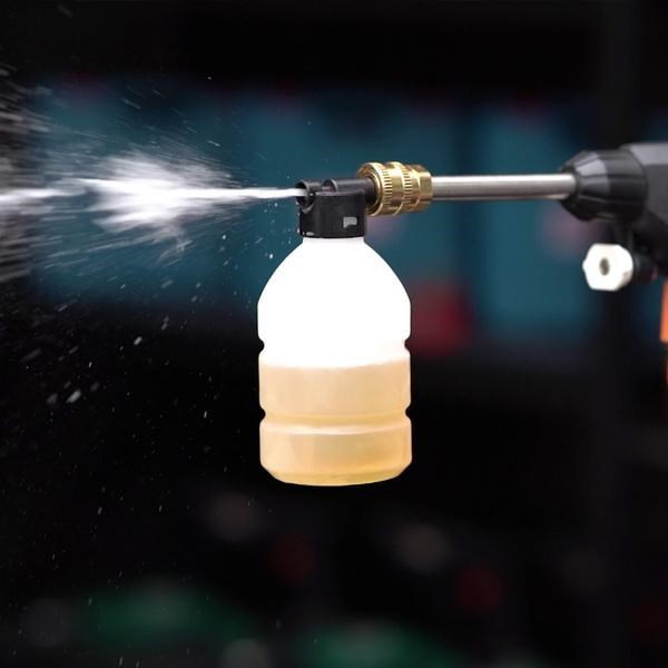 Pripojiteľná fľaša s mydlovou penou umožňuje naplniť čistiace prostriedky a účinne napeniť povrchy pre ešte lepšie výsledky. Širokouhlá tryska zjednodušuje čistenie veľkých plôch, zatiaľ čo presná tryska umožňuje cielené, bodové čistenie.