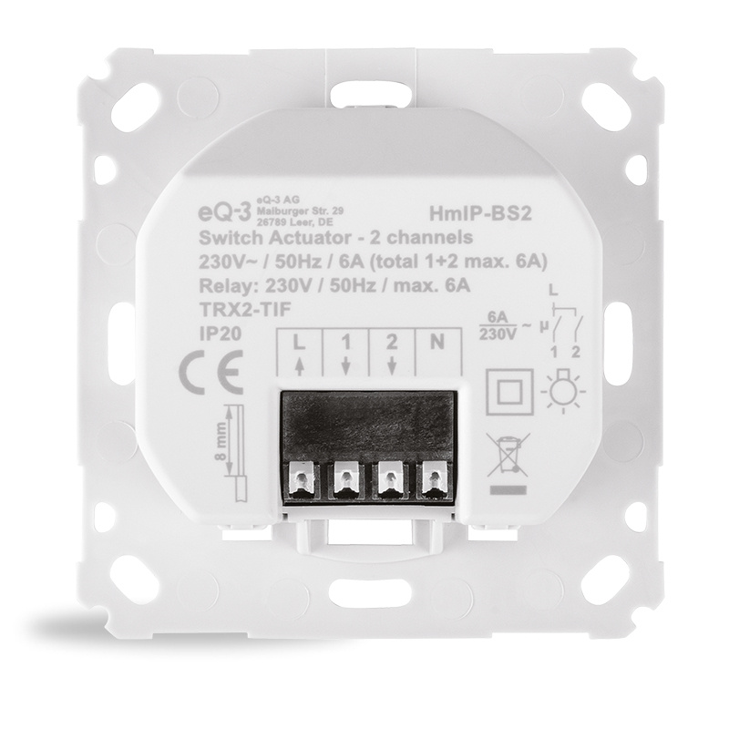 Spínací akčný člen (HmIP-BS2) sa montuje do štandardnej zápustnej elektroinštalačnej krabice pod omietku s pripojením do siete 230 V. Bezdrôtová komunikácia ponúka možnosť inštalácie bez potreby druhej kabeláže. To znamená, že akčný člen je možné umiestniť v mieste pripraveného alebo existujúceho elektrického rozvodu siete 230 V.