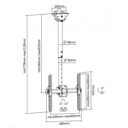 Stropný držiak televízie Fiber FN-T400 Stropný držiak na TV 32-60" plne polohovateľný, TOP kvalita Držiak na zaveste televízorov a monitorov na stropné konštrukcie. Držiak je plne nastaviteľný: otáčanie do strán, náklon, dĺžka od stropu, korekcia roviny, aj na šikmé stropy +/-60°, možnosť kolmého otočenia úchytu a inštalácie aj na zvislé plochy. Celoocelová konštrukcia s vynikajúcou pevnosťou, možnosť zavesiť televízory s hmotnosťou aj 50kg. Top kvalita, plná nastaviteľnosť, spoľahlivosť a bezpečnosť, to sú hlavné prednosti tohto stropného držiaku na televízory a monitory. Profesionálny stropný držiak na televízie aj monitory 32-65 palcov, otočný do strán, možnosť veľkého náklonu, dĺžkové nastavenie, systém skrytého vedenia káblov, nosnosť 50kg. Stropný držiak TV Fiber FN-T400 Technické údaje: nosnosť 50kg podpora VESA 200x100 až 400x400 na televízie a monitory s uhlopriečkou 32" až 60" (podľa VESA a hmotnosti aj väčšie) nastavenie dĺžky držiaka 560mm až 910mm otáčanie do strán +/- 180° náklon 0° až -25° korekcia roviny obrazu +/- 3° možnosť zaveste na vodorovné aj na šikmé stropné konštrukcie +/- 60° možnosť zaveste aj na zvislé plochy ocelová konštrukcia výbornej kvality systém pre skryté vedenie káblov farebné prevedenie čierne záruka 5 rokov Stropný držiak na televízie a monitory Fiber FN-T400 podporuje VESA štandardy: VESA 200x100 VESA 200x200 VESA 300x100 VESA 300x200 a 200x300 VESA 300x300 VESA 400x200 a 200x400 VESA 400x300 a 300x400 VESA 400x400