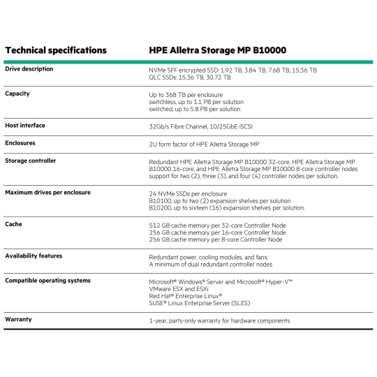 Žádné kompletní výměny: Díky programu HPE Timeless Storage pro HPE Alletra Storage MP B10000 můžete chránit své investice a udržovat úložiště neustále aktuální pomocí aktualizace řadiče bez přerušení provozu. Tím se sníží vaše celkové náklady na vlastnictví a ušetříte v průměru 30 % oproti tradičním kompletním výměnám. Neustále se zlepšující datové služby: Využijte plný potenciál HPE Alletra Storage MP B10000 s naším komplexním předplatným softwaru. Získejte přístup ke všem funkcím a vylepšením našeho operačního systému, včetně cloudových operací řízených umělou inteligencí v cloudu HPE GreenLake, bez dalších nákladů. Spolehněte se na 100% dostupnost dat – zaručeno: Zapomeňte na přerušení provozu způsobená neočekávanými výpadky. HPE Alletra Storage MP B10000 je platforma řízená umělou inteligencí, rozdělená a bez jediného bodu selhání, která zaručuje odolnou 100% dostupnost dat pro každého zákazníka a každé pole. Ukládejte více za méně s HPE StoreMore Guarantee: To zaručuje celkovou úsporu minimálně 4:1 pro vaše pracovní zatížení – snížení nákladů na fyzické úložiště, úsporu energie a zmenšení stopy datového centra. 30denní záruka spokojenosti: Vyzkoušejte HPE Alletra Storage MP B10000 po dobu 30 dnů bez rizika. Pokud nebudete zcela spokojeni s výhodami a schopnostmi vašeho úložného systému, jak jsou popsány v produktových specifikacích, budeme s vámi spolupracovat na nápravě.
