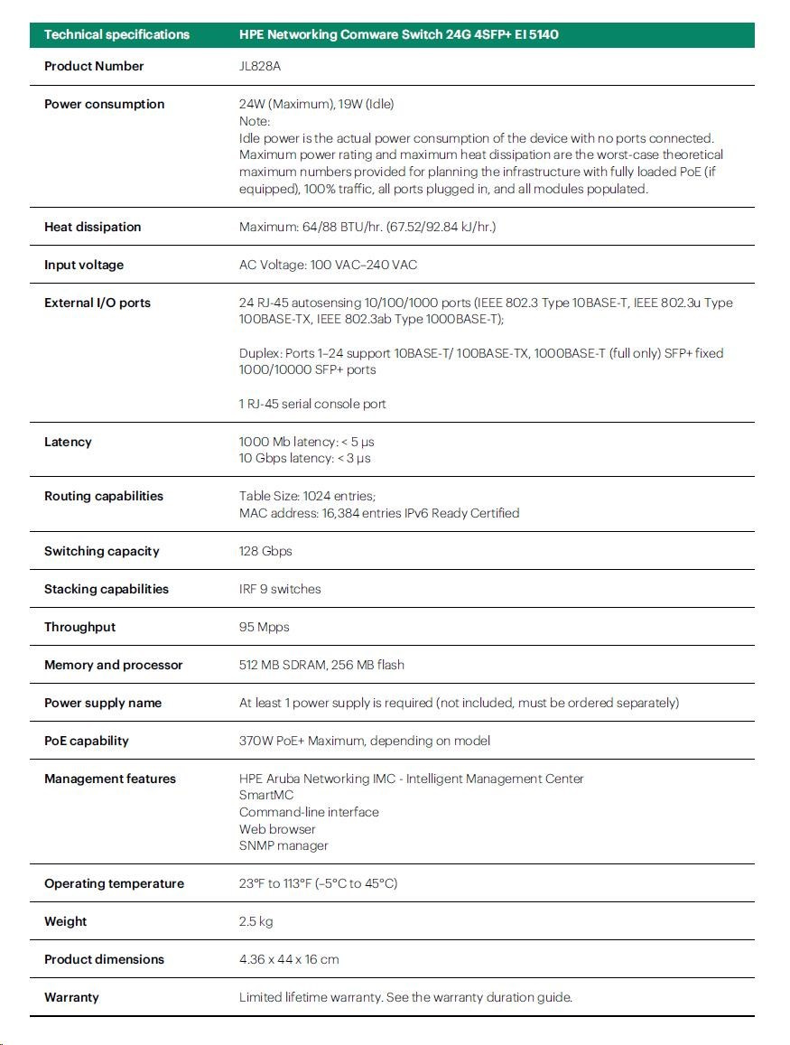| Management | IMC - Intelligent Management Center; SmartMC; command-line interface; Web browser; SNMP Manager | |