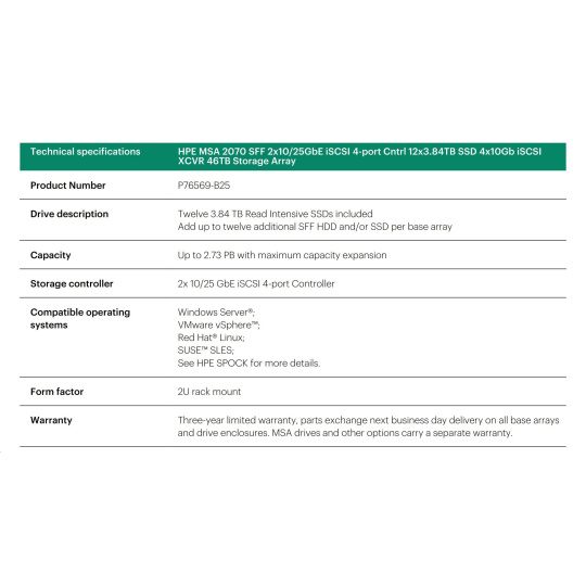 HPE MSA 2070 SFF 2x10/25GbE iSCSI 4-port Cntrl 12x3.84TB SSD 4x10Gb iSCSI XCVR 46TB Storage Array.