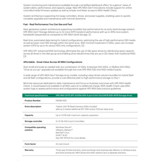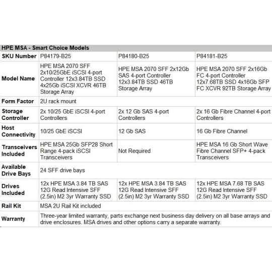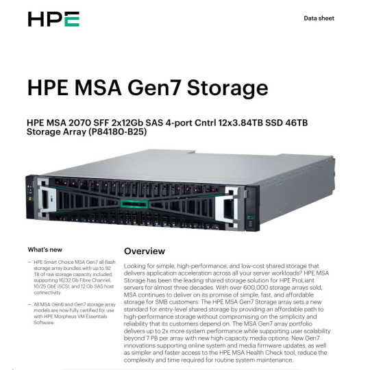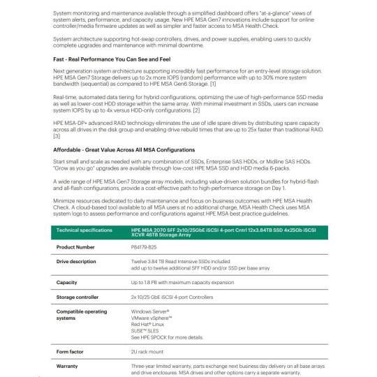 HPE MSA 2070 SFF 2x10/25GbE iSCSI 4-port Controller 12x3.84TB SSD 4x25Gb iSCSI XCVR 46TB Storage Array Smart Choice.