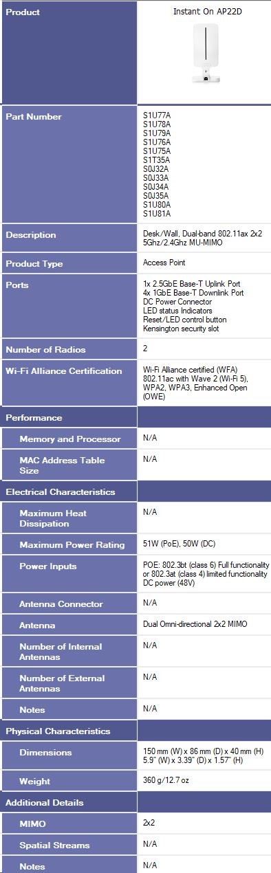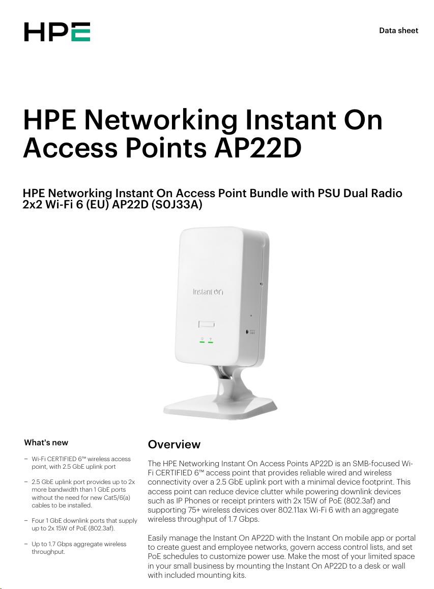 HPE Aruba Instant On Access Point AP22D Bundle with PSU Dual Radio 2x2 Wi-Fi 6 (EU) AP22D (desktop or wallmount)