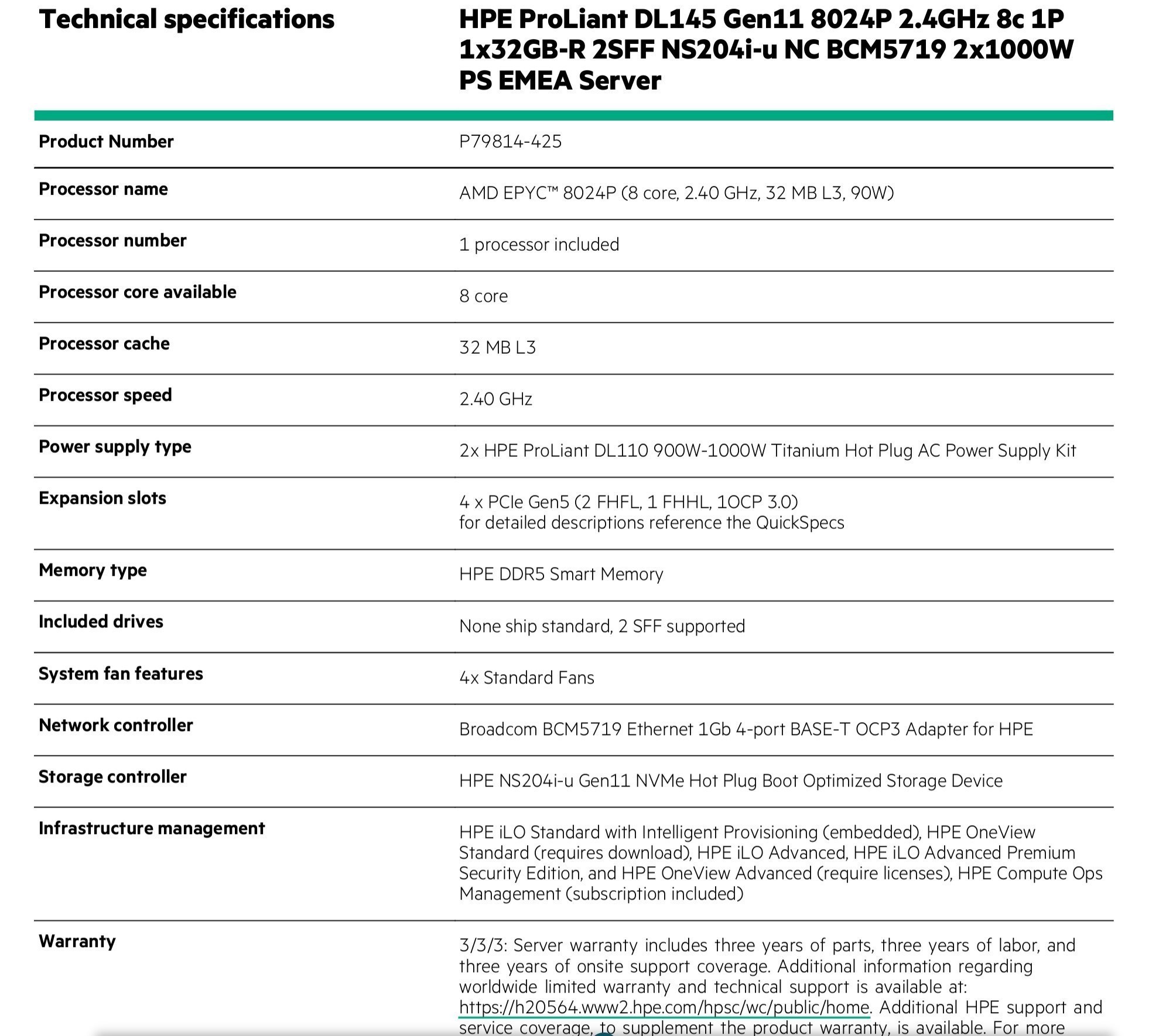 | 3/3/3: Server warranty includes 3 years of parts, 3 years of labor, and 3 years of onsite support coverage. Additional information regardingworldwide limited warranty and tech support is available at:https://h20564.www2.hpe.com/hpsc/wc/public/home. Add HPE support and service coverage to supplement the product warranty https://www.hpe.com/support |