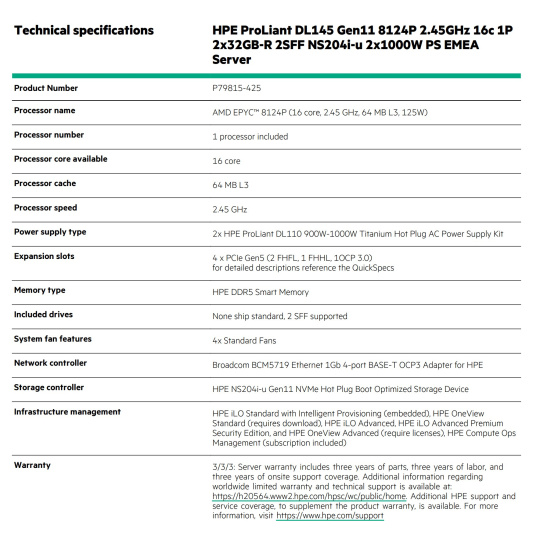 | Technical specifications | HPE ProLiant DL145 Gen11 8124P 2.45GHz 16c 1P2x32GB-R 2SFF NS204i-u 2x1000W PS EMEAServer |
