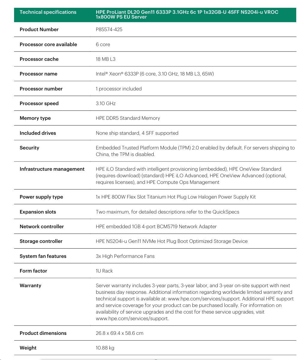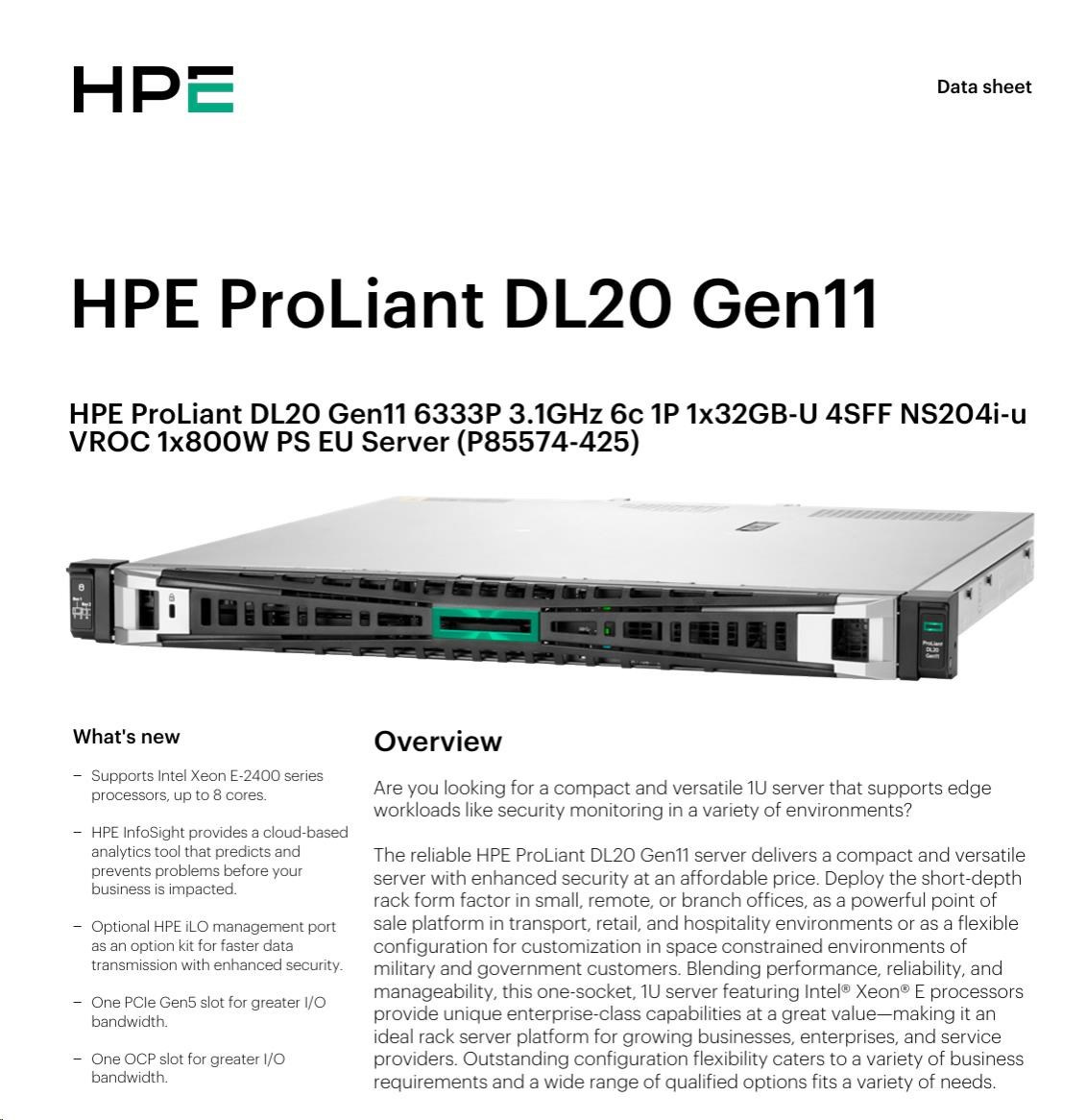 HPE PL DL20 gen11 6333P (3.1G/6C12T) 1x32G (P64339) 4SFF NS204i-u (2x480Gnvme) VROC 1x800W 4x1G NBD333 Smart Choice.