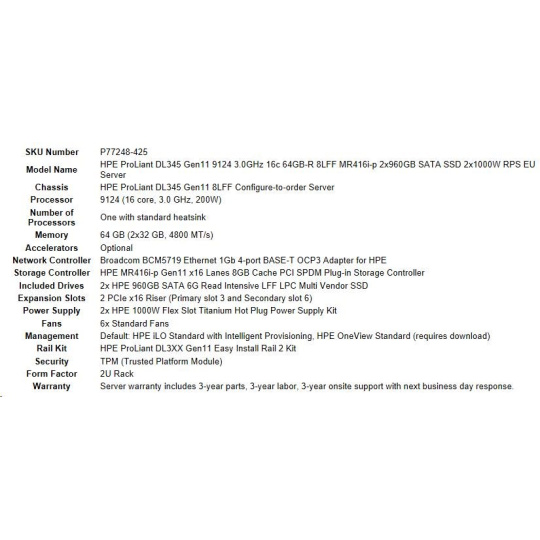 | Model Name | HPE ProLiant DL345 Gen11 9124 3.0GHz 16c 64GB-R 8LFF MR416i-p 2x960GB SATA SSD 2x1000W RPS EU Server |