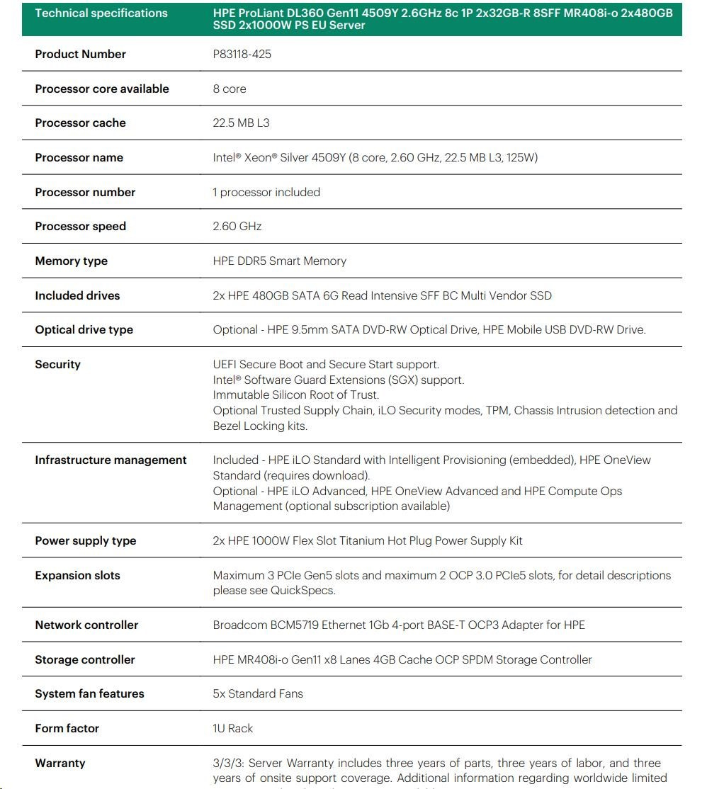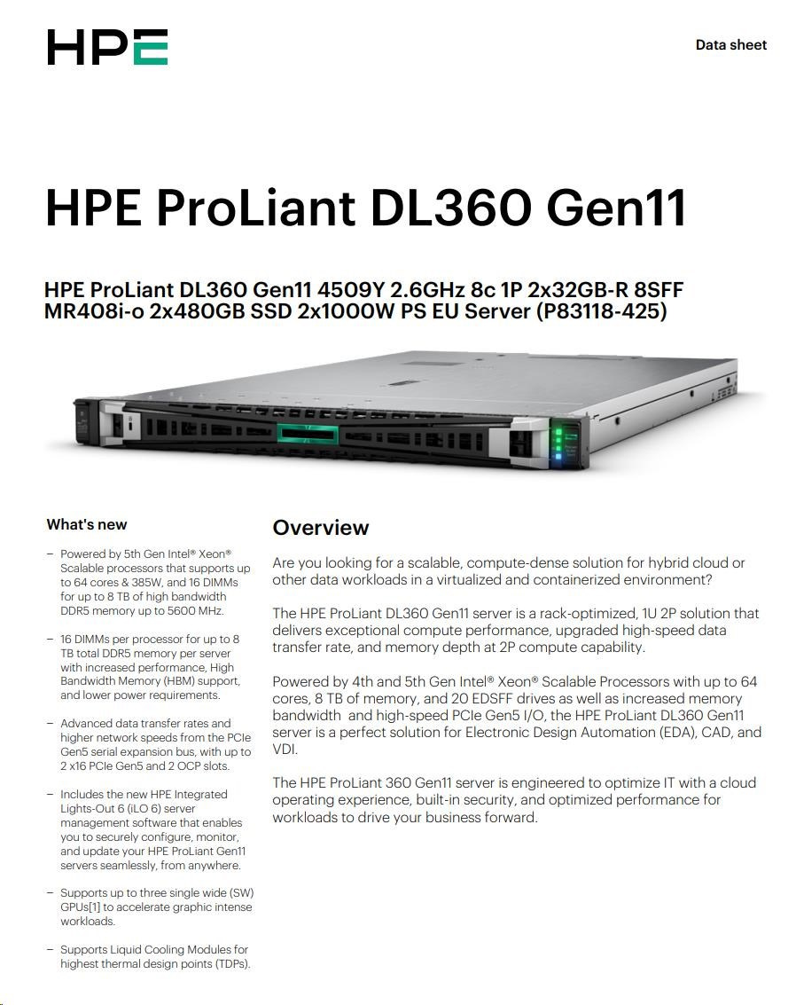 HPE PL DL360g11 4509Y (2.6G/8C) 2x32G (p64706) 2x480G 2x1000W MR408i-o 8SFF 4p1G ocp Smart Choice.
