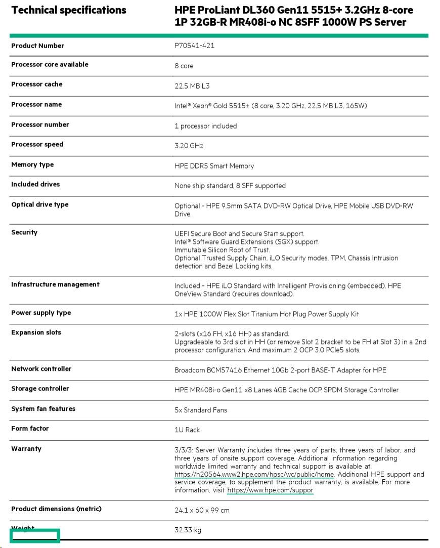 Model Name HPE PL DL360g11 5515+ (3.2/8C/165W) 1x32G MR408i-o/4G 8-10SFF 1x1000W 2x10G-T NBD333 1U