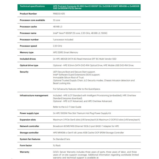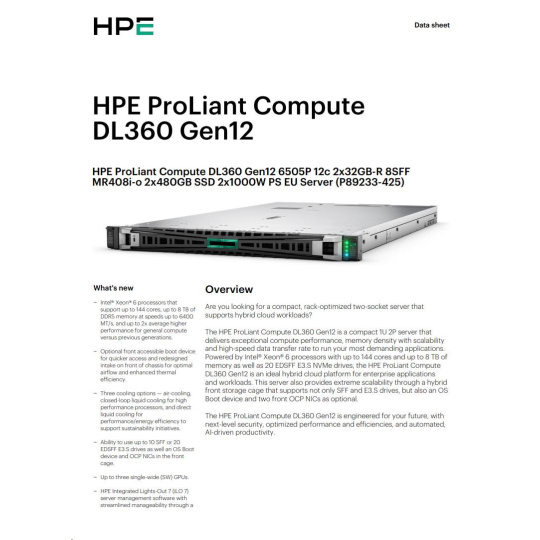 HPE PL DL360g12 6507P (3.5G/8C) 2x32G (P69727) 2x480G MR408i-o 8SFF 2x1000W 10GbE NBD333 Smart Choice