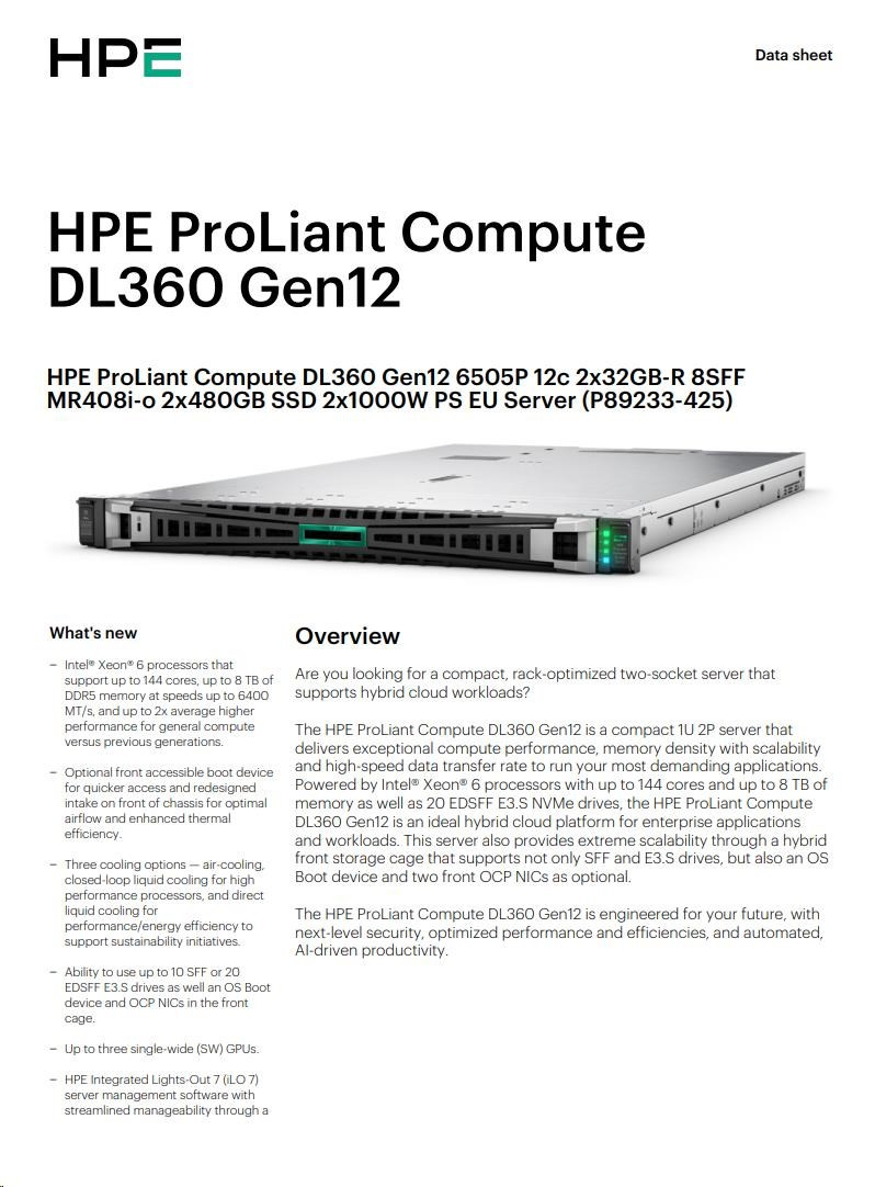 HPE PL DL360g12 6507P (3.5G/8C) 2x32G (P69727) 2x480G MR408i-o 8SFF 2x1000W 10GbE NBD333 Smart Choice