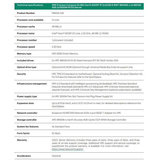 HPE PL DL380 Gen12 6505P (2.2/12C) 2x32G (P69727) 2x480G MR408i-o 8SFF 2x1000W 10GbE NBD333 Smart Choice.