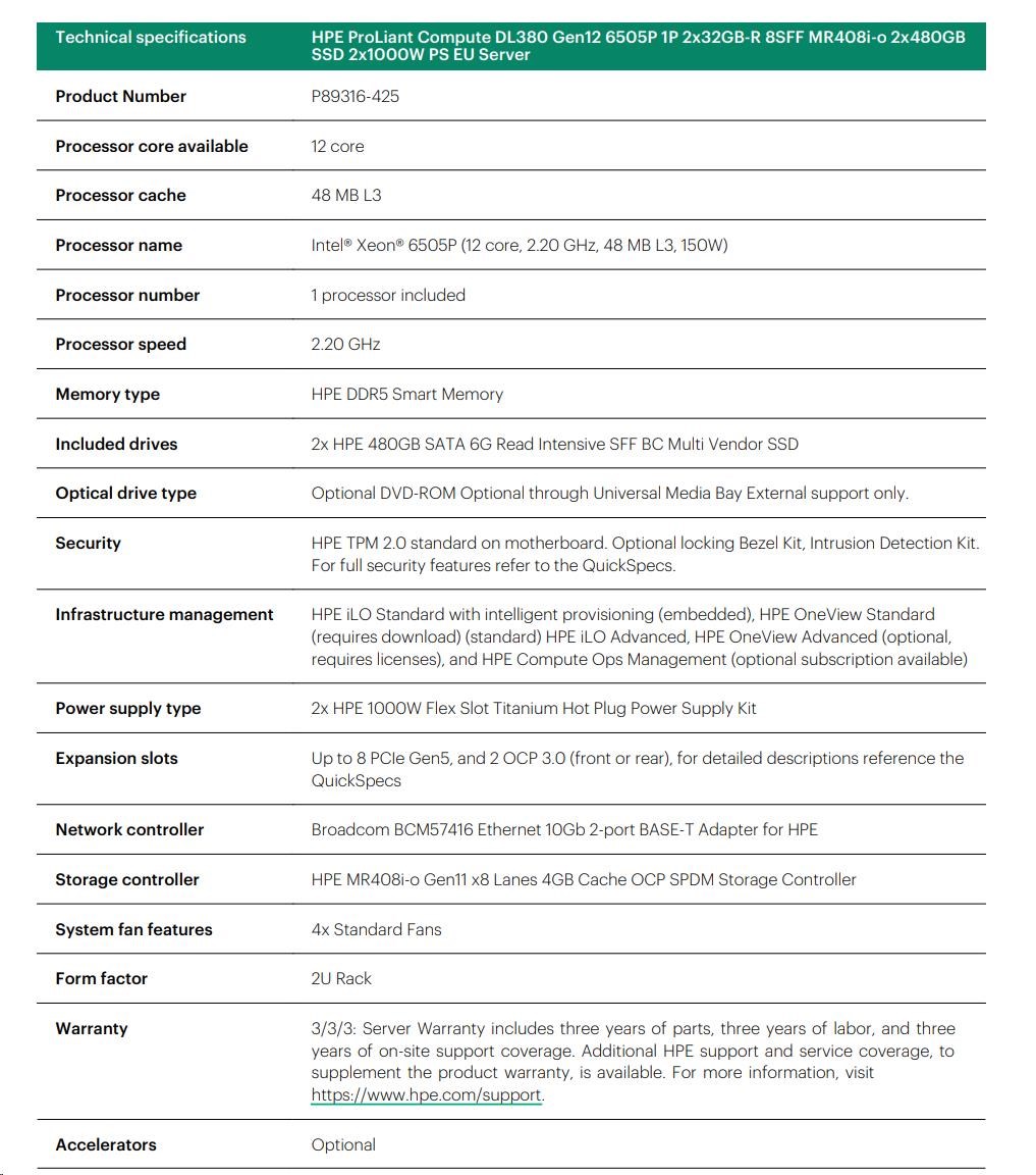 HPE PL DL380 Gen12 6505P (2.2/12C) 2x32G (P69727) 2x480G MR408i-o 8SFF 2x1000W 10GbE NBD333 Smart Choice.