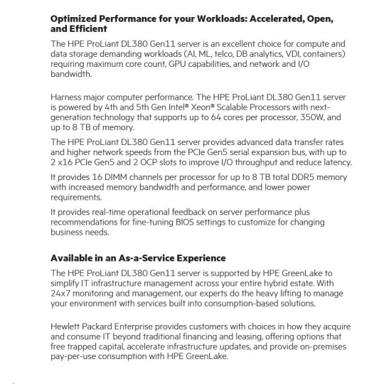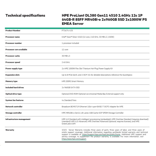 Model Name HPE PL DL380g11 4510 (2.4/12C) 2x32G 2x960G 8SFF MR408i-o 2x1000W 4x1Gb NBD333