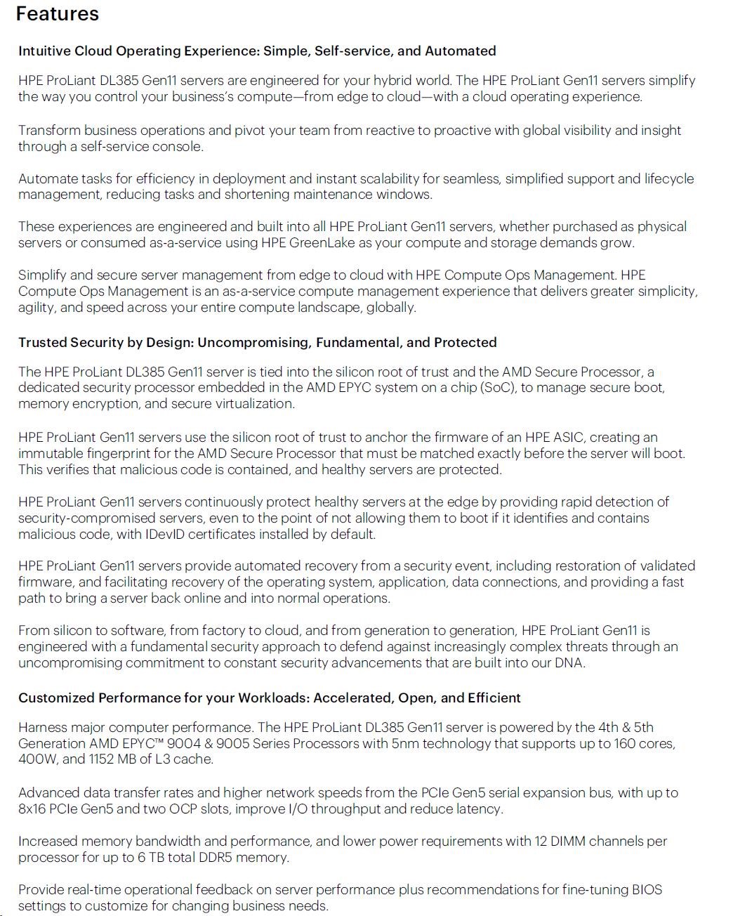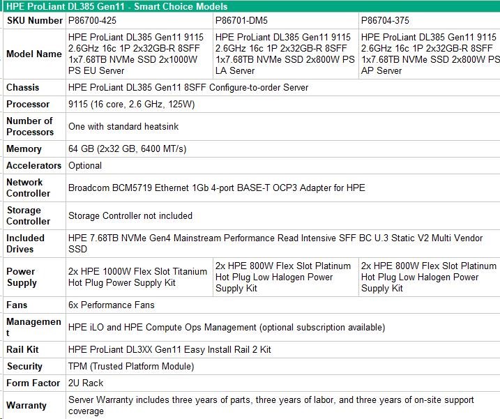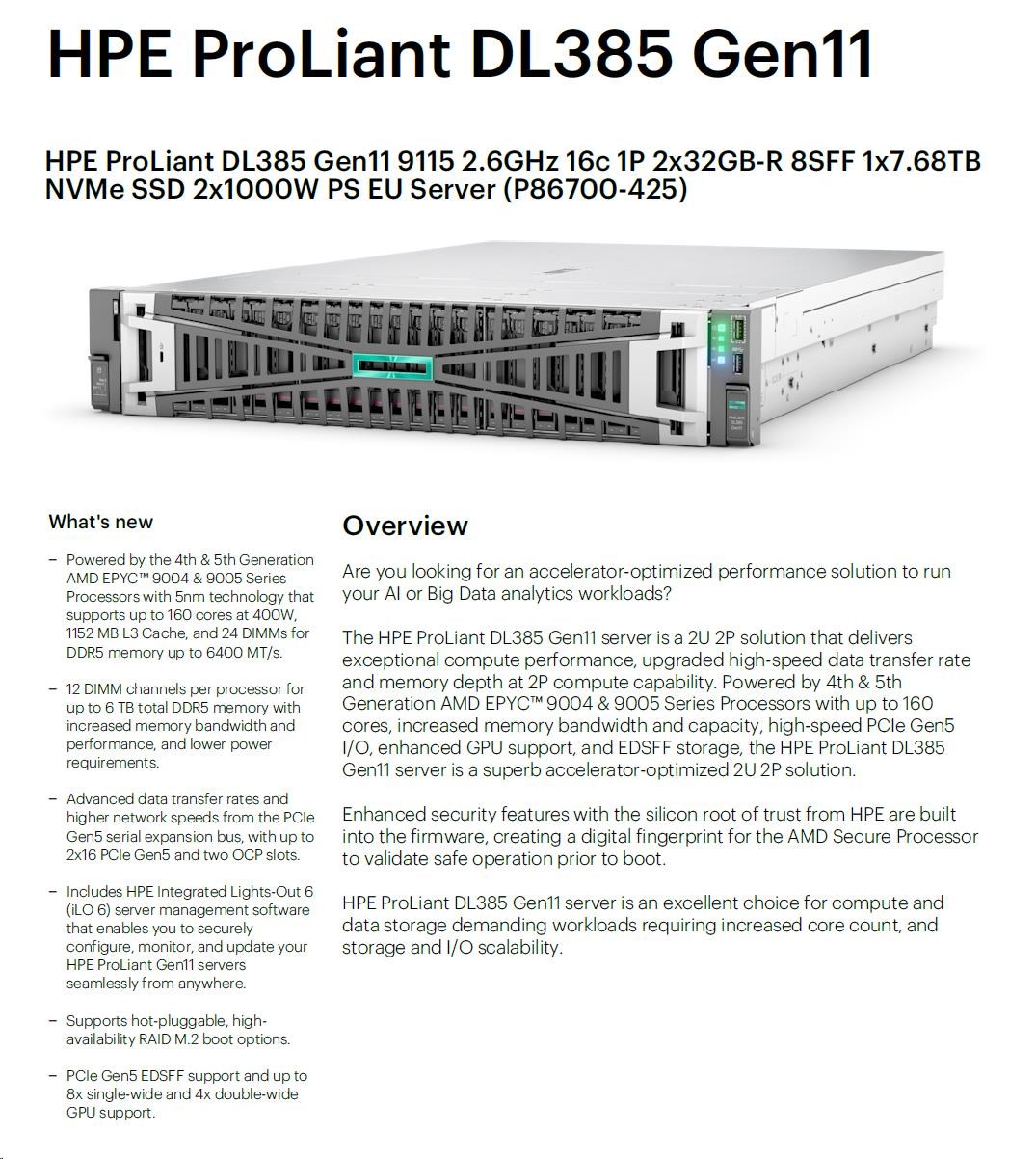 Technical specifications HPE ProLiant DL385 Gen11 9115 2.6G 16c 1P 2x32GB-R 8LFF NS204i-u NC BCM57416 2x1000W PS EU
