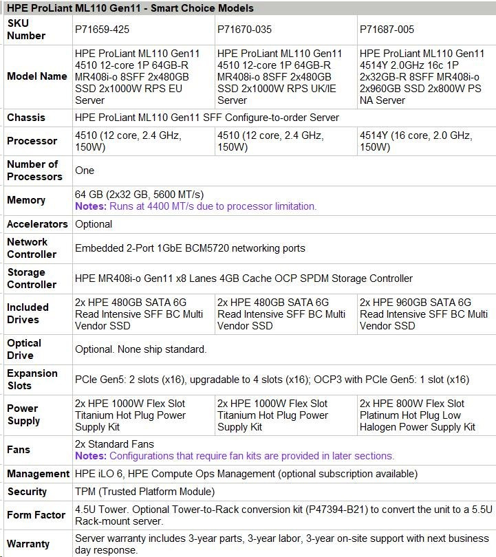 HPE PL ML110g11 4510 (2.4G/12C) 2x32G (P64706) 2x480G (P40497) 2x1000W MR408i-o 8SFF 2x1G NBD333 Smart Choice