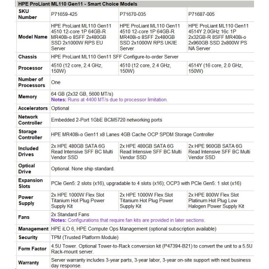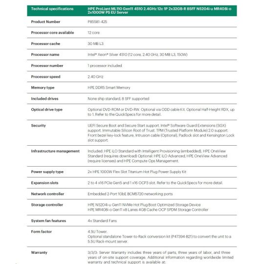 HPE PL ML110g11 4510 (2.4G/12C) NS204(2x480) 2x32G (P64706) MR408i-o 2x1000W 8SFF 2x1G NBD333 Smart Choice.