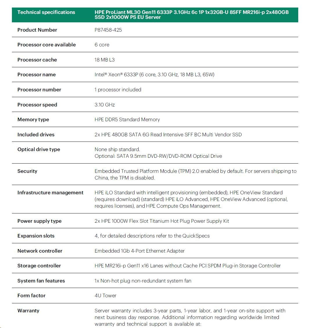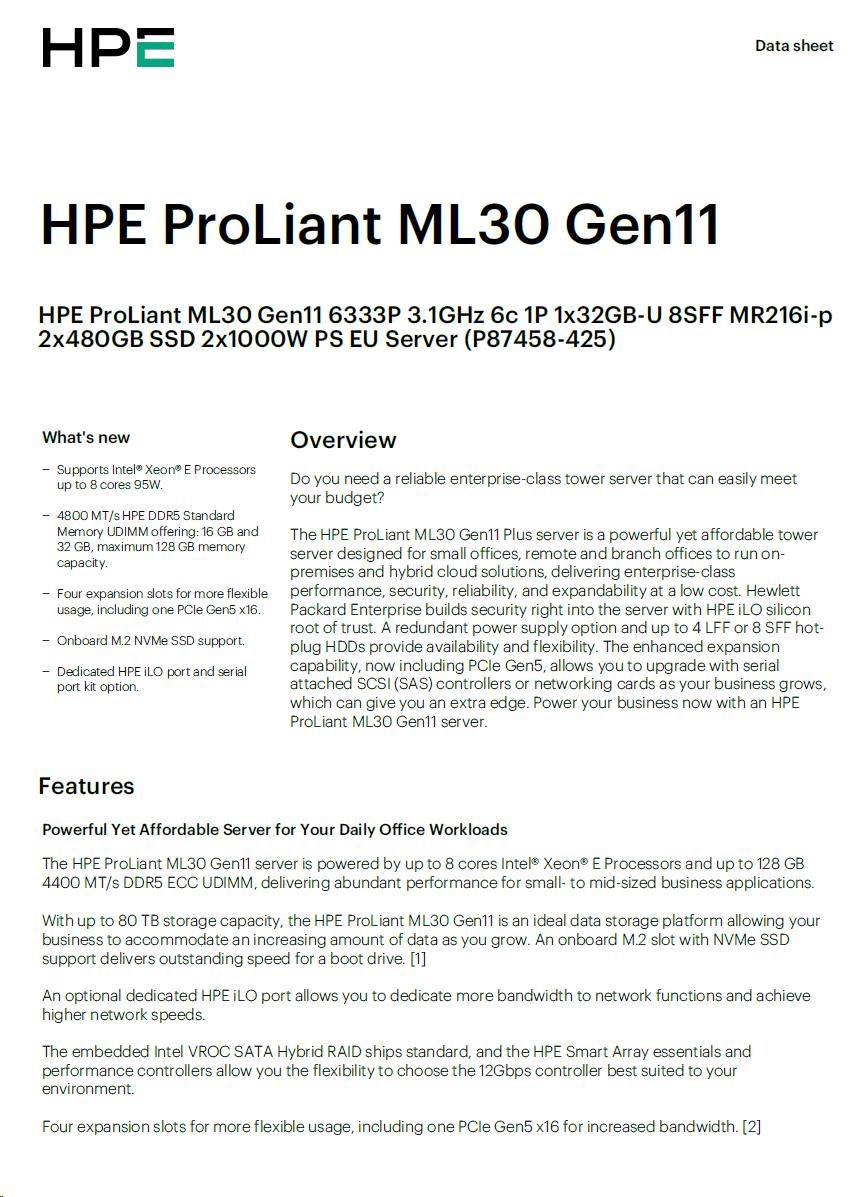 HPE PL ML30g11 6333P (3.1G/6C12T) 1x32G 2x480G 2x1000W MR216i-p 8SFF 4p1G NBD311 Smart Choice.