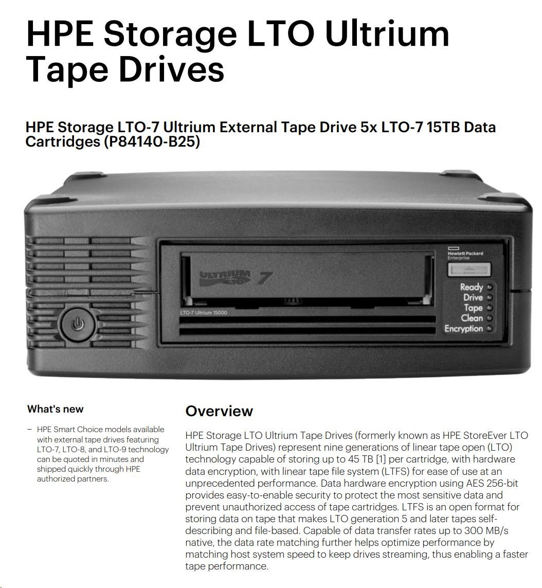 HPE Storage LTO-7 Ultrium External Tape Drive 5x LTO-7 15TB Data Cartridges.