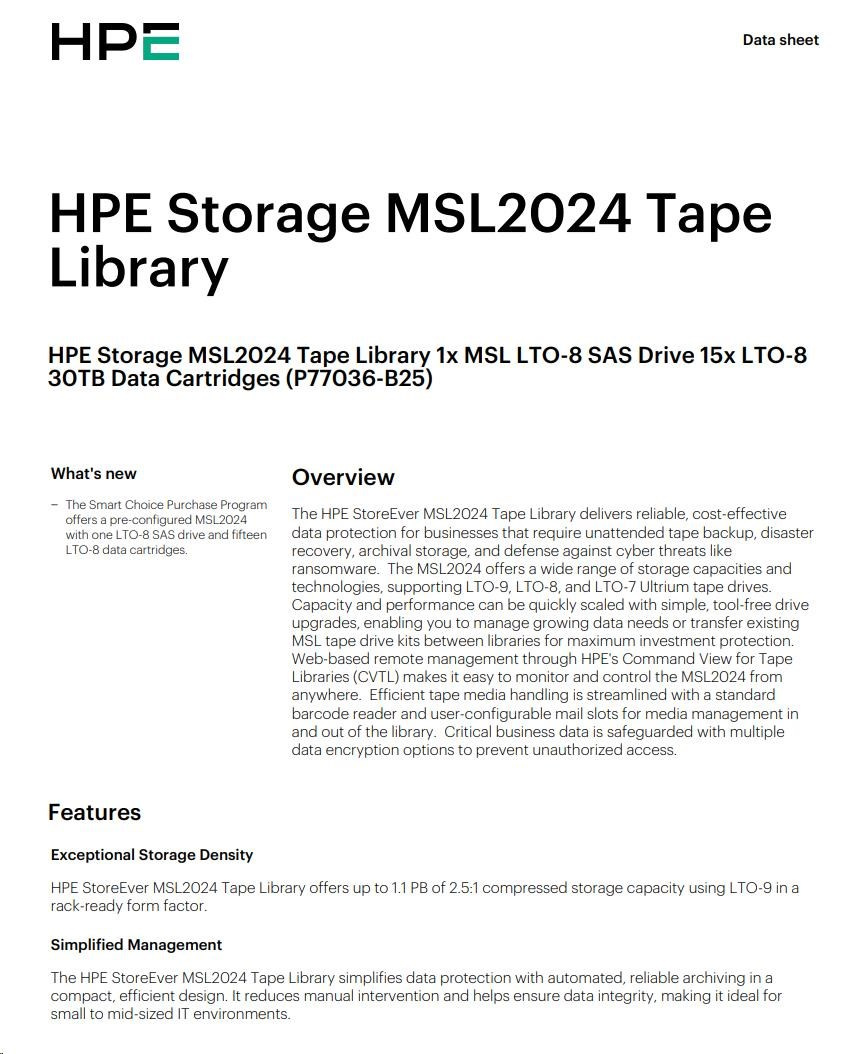 HPE Storage MSL2024 TapeLibrary (AK379A+LTO8S ASDriveQ6Q68A+15xQ2078A LTO8 30TBDataCartridges+Q2015ABarCodeLabelPack) SC