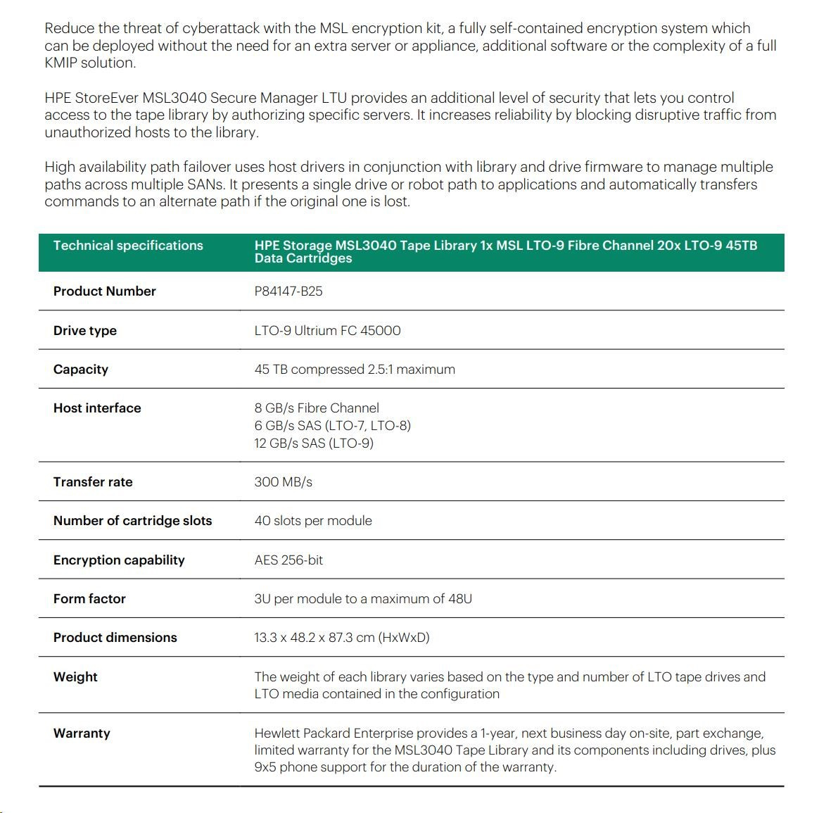 | Key Features - Exceptional storage density: 1.08 PB (2.5:1 compression using LTO-9 tape cartridges). - Easy-to-use web-based remote management for multiple libraries with HPE Command View for Tape Libraries (CVTL). - Integrated bar code reader. - Tool-free tape drive upgrades. - Leverage tape drives in an MSL2024 into an MSL3040 or 6480 for investment protection. - Removable magazines with user-configurable mail slots. - Extensive OS and software compatibility testing. - Achieve the highest level of encryption security to secure confidential business information while meeting compliance guidelines with the HPE MSL Encryption Kit or KMIP 1.2 Encryption Key Manager License. - Proactively monitor utilization, operational performance, and overall life and health of the drives and media with TapeAssure Advanced, a licensed feature of CVTL. |