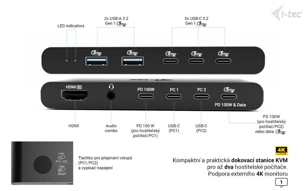 i-tec KVM Docking Station HDMI pre 2 hostiteľov, Power Delivery 2x 100W