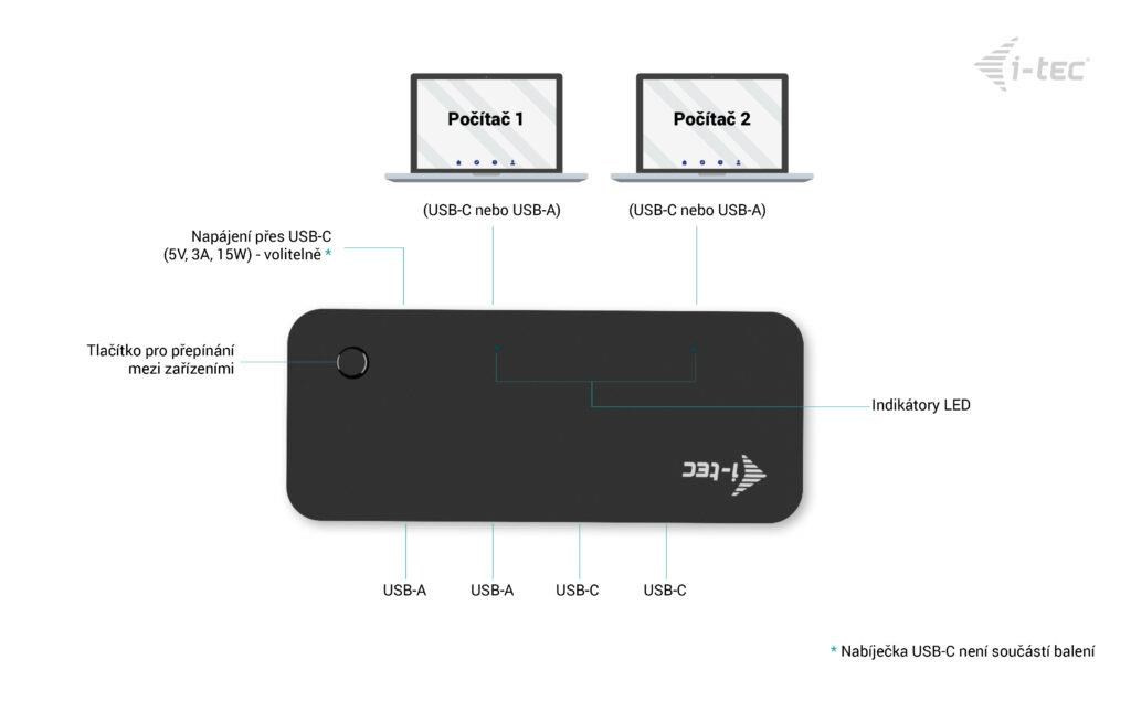 - Malý, šikovný HUB, ku ktorému môžete pripojiť dva notebooky či počítače, a pripojené USB zariadenia medzi nimi jednoducho a pohodlne zdieľať