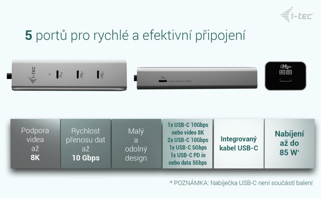 i-tec USB-C Charging Metal HUB 5port s USB-C video 8K + Power Delivery 85W
