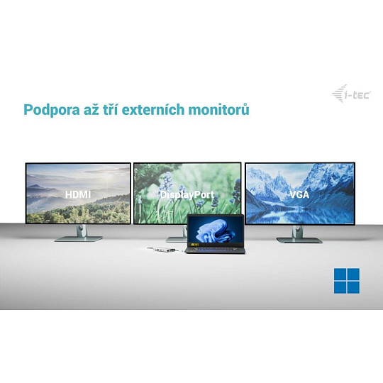 - Podpora až tří monitorů – HDMI, DisplayPort a VGA pro flexibilní rozšíření pracovní plochy
