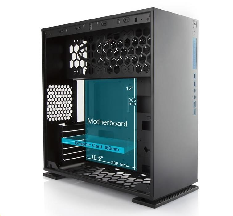 - Vnútri je priestor pre grafickú kartu s dĺžkou až 350 mm a chladič procesora s dĺžkou až 160 mm.