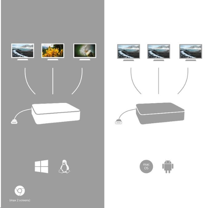 1/ Operačný systém macOS nepodporuje technológiu Multi Stream Transport (MST), čo znamená, že po pripojení k systému macOS sa na všetkých pripojených monitoroch bude premietať rovnaký obraz.