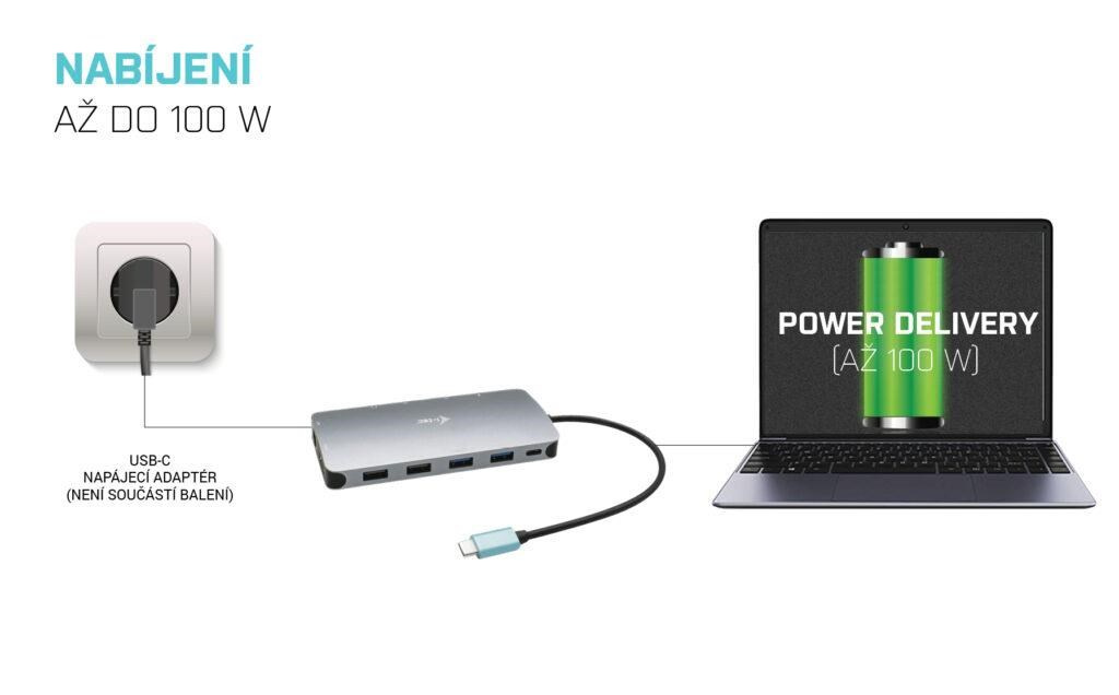 Malá kovová dokovacia stanica USB-C, ku ktorej možno pripojiť až tri externé monitory*. Stačí pripojiť notebook alebo tablet (bez potreby ovládačov) a využiť rýchle dátové pripojenie USB, pripojenie k internetu cez port LAN a možnosť pripojiť slúchadlá a mikrofón. Samozrejme, podporuje napájanie notebooku až do 100 W, čo znamená, že budete môcť nabíjať všetky notebooky a tablety, ktoré podporujú nabíjanie cez USB-C (USB-C Power Delivery).