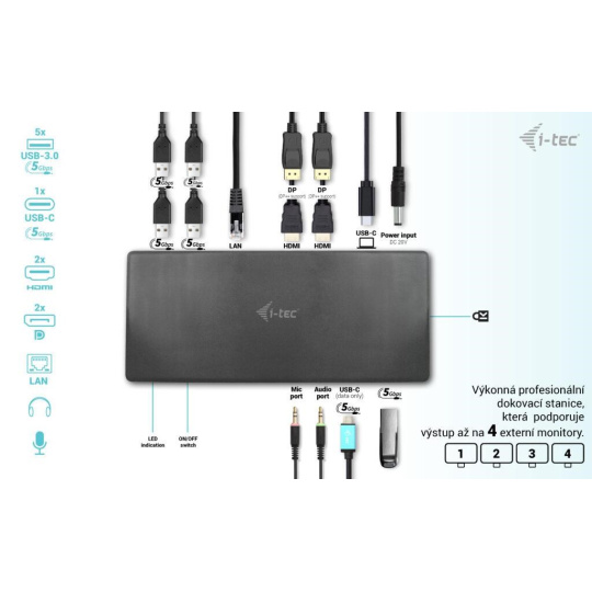 Profesionálna dokovacia stanica USB-C, ktorá podporuje výstup až pre štyri externé monitory. Táto dokovacia stanica je vybavená hybridným zobrazovaním: je postavená na technológiách prenosu obrazu DisplayLink a USB-C, čo jej umožňuje spracovávať obraz až na štyroch zobrazovacích zariadeniach.