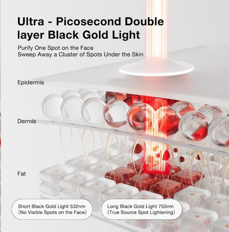 - Režim WHITEN (Bielenie škvŕn): Cielene sa zameriava na tmavé pigmentové škvrny, pihy a stopy po akné. Energia je pohltená nahromadeným melanínom, ktorý sa teplom rozloží na menšie častice a telo je následne prirodzene odbúrané. Škvŕny tak postupne blednú a sú menej viditeľné.